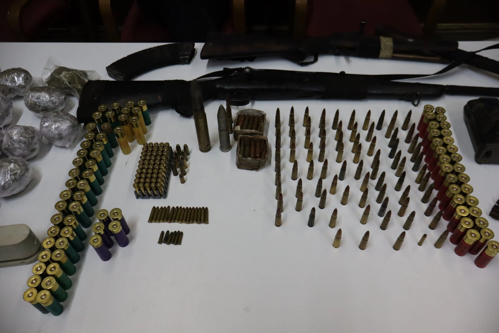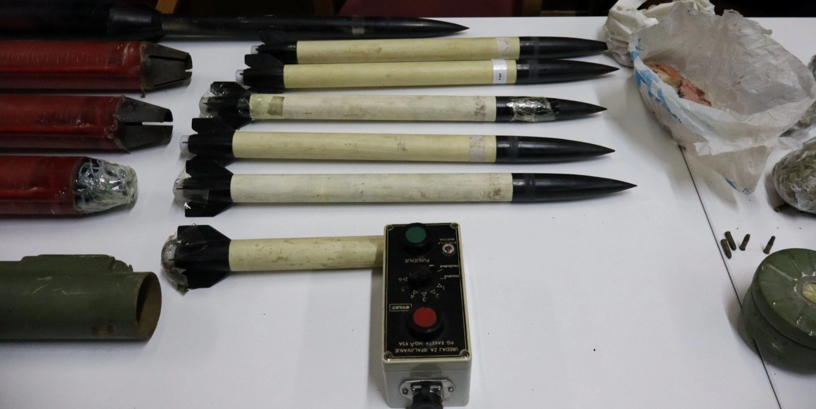 Prilikom pretresa pronađeni su i privremeno oduzeti slijedeći predmeti: dvije puške, okvir za automatsku pušku, ručni bacač, više komada protugradnih raketa, veća količina municije različitih kalibara (za automatsko, poluautomatsko i lovačko oružje), ručna bomba, dvije lovačke kamere, dvije vrećice sa crvenom materijom koja svojim karakteristikama asocira na eksploziv, četrnaest (14) pakovanja sa sadržajem biljne materije koja svojim izgledom asocira na opojnu drogu, aparat za vakumiranje i drugi predmeti koji će biti korišteni u dokaznom postupku (oduzete materije će biti predmet vještačenja).